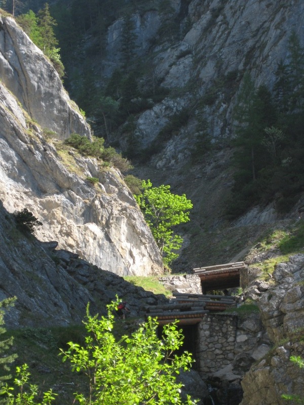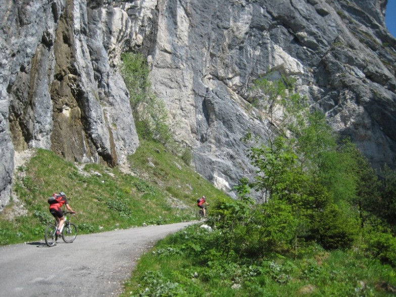 Ein landschaftliches Wunderwerk tut sich in dieser Traumtour auf. Steil (25%) zieht sich unter hohen Felswänden die Forststraße durch die Öfen hinauf. Über fünf Holzbrücken müssen wir hinauftreten. Nur ein schmaler Steig führte zu den Almen des Dachsteinplateaus. Oben angekommen labten wir uns ausgieb auf der Ritzingerhütte (Steirerkrapfen mit Kas und Marmelade). Nach steil bergabführender Forststraße gelangten wir zum Salza-Stausee hinunter. Am rechten Ufer des Salzastausees entlang fuhren wir über eine wildromantische, schmale Straße zuletzt durch 2 kurze Tunnels vorbei. Zuletzt mußten wir noch einen kurzen Anstieg hinauf auf den Mitterberg überwinden wo wir unser „Domizil“ den Berghof erreichten.