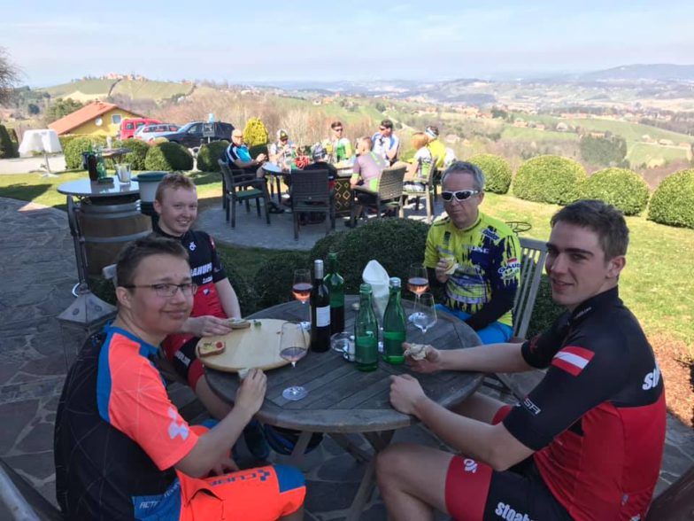 Gemeinsam wurde die Klapotetz-Tour bestritten, wobei man bei gemütlichem Tritt noch genügend Luftreserven hatte, um sich blendend mit seinen Nachbarn zu unterhalten. In Kitzeck durften wir uns wieder mit Broten und Traubensaft (auch vergorenem) stärken, bevor die Runde über Petzles und Kittenberg wieder zurück nach Leibnitz führte. Im Rathaus Leibnitz wurden wir abermals mit feinen Speisen und Getränken bewirtet, wobei man in geselliger Runde den schönen Frühlingstag ausklingen ließ.